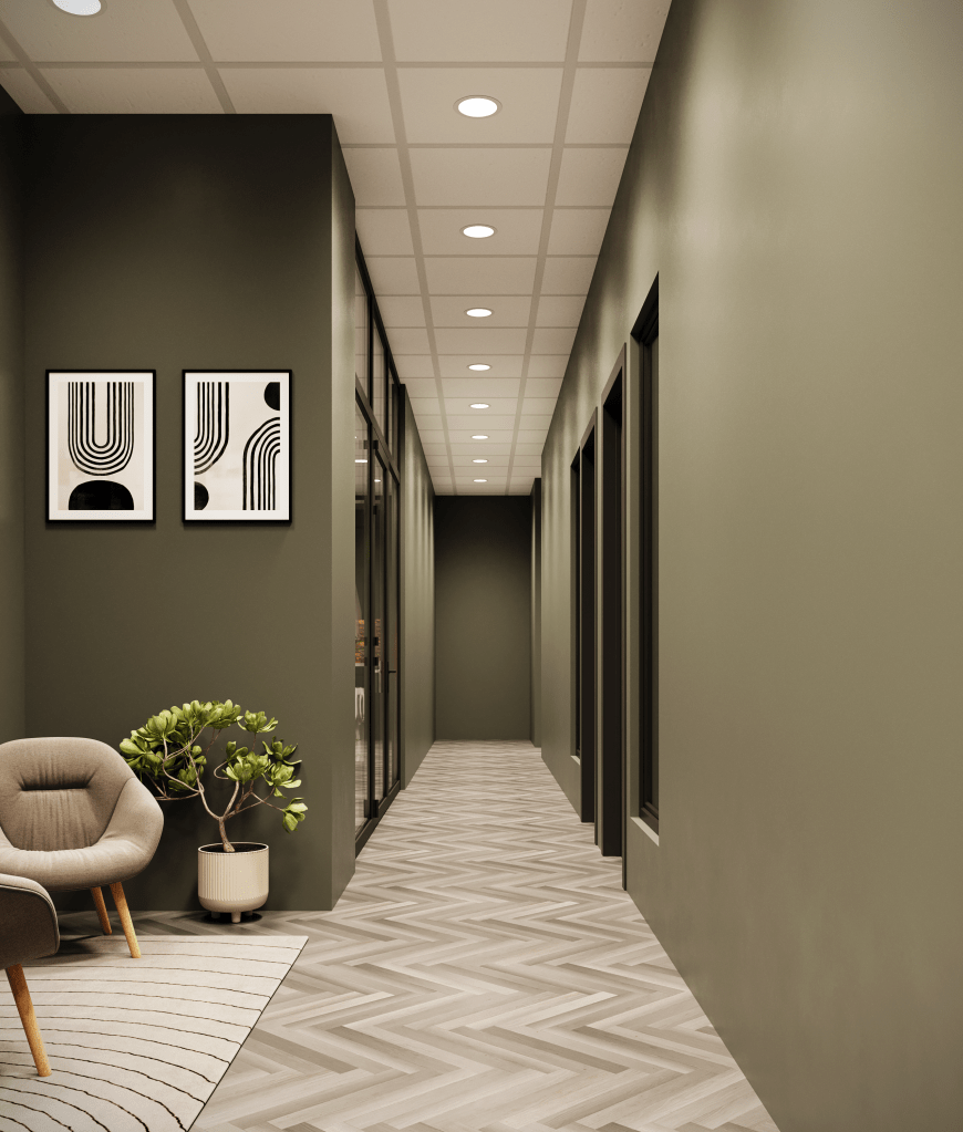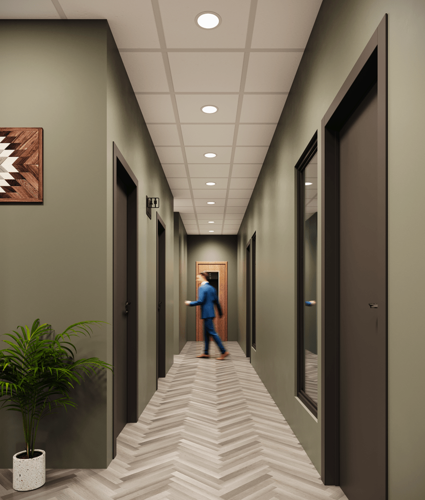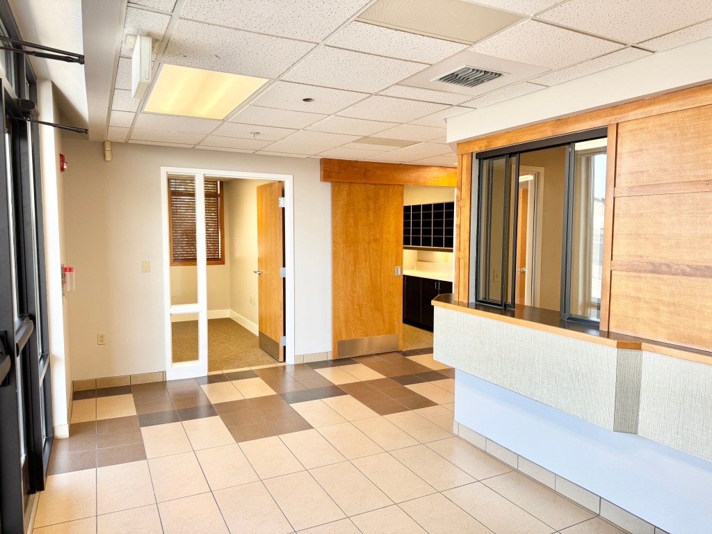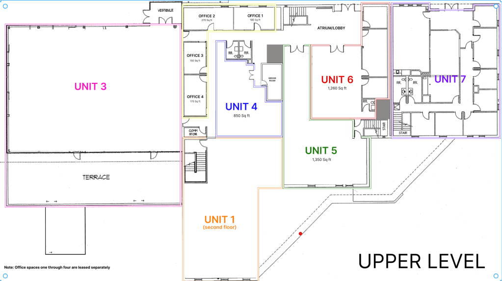 850 sq ft. located down the West hallway, with a full glass entrance and open layout. It is currently available and can be built to suit.