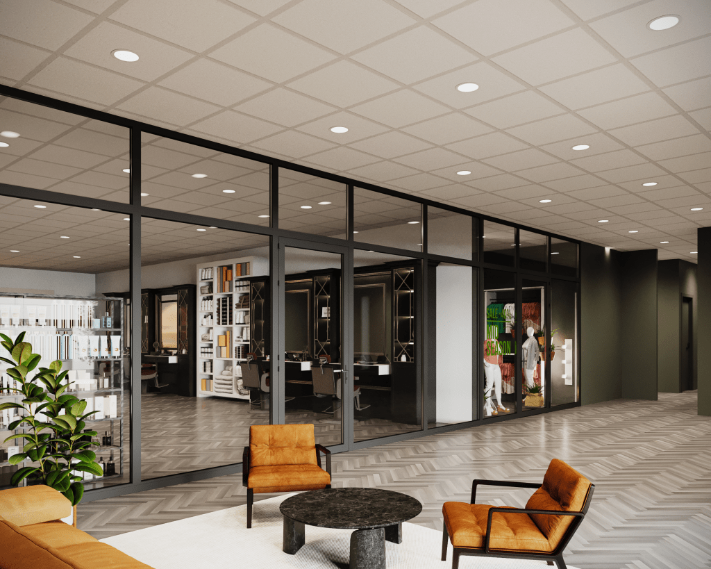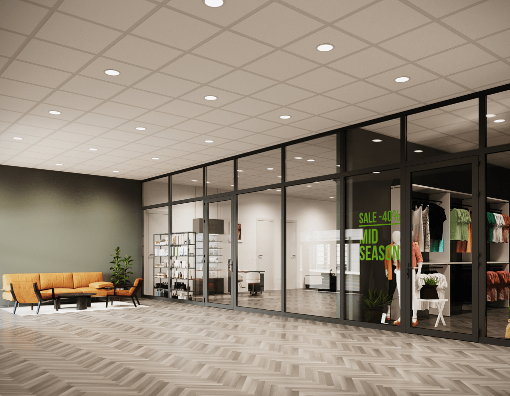 1,350 sq ft. With an entrance off the main lobby and a full glass entrance. With its open layout and windows, it’s perfect for a boutique, retail store, or other creative uses.